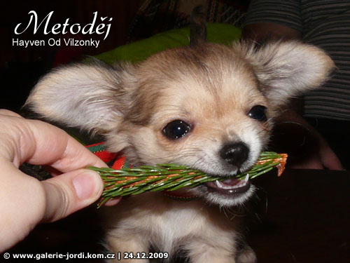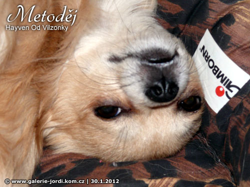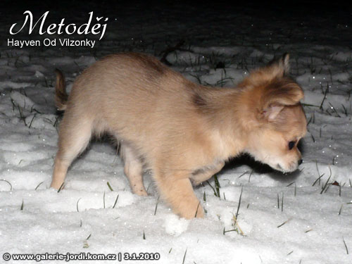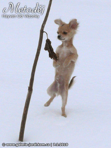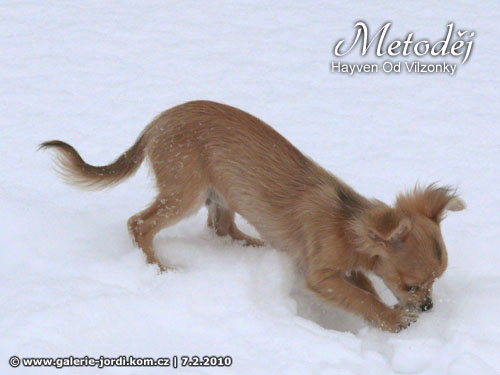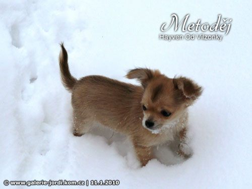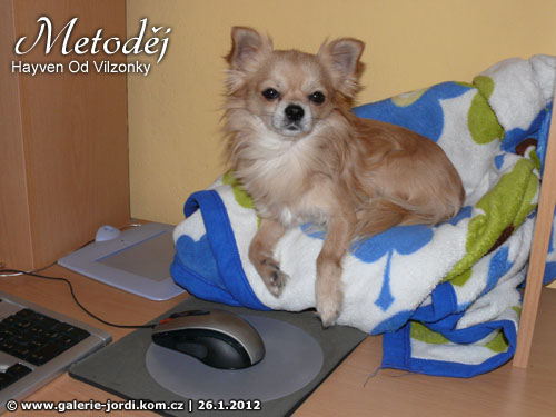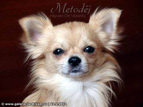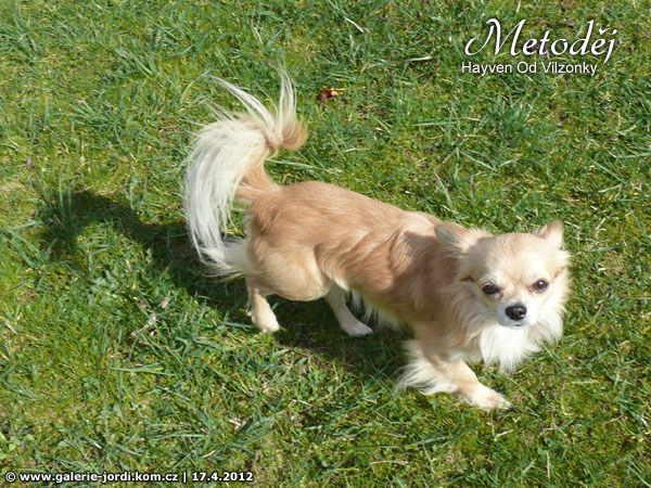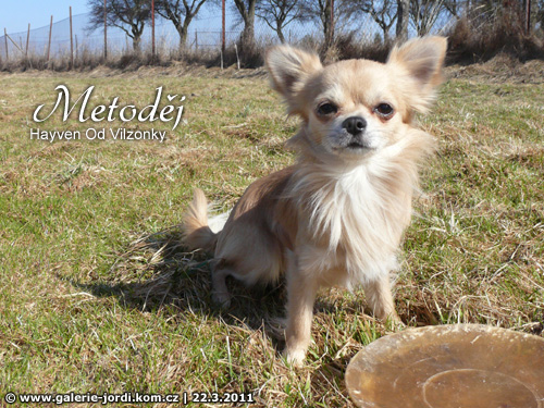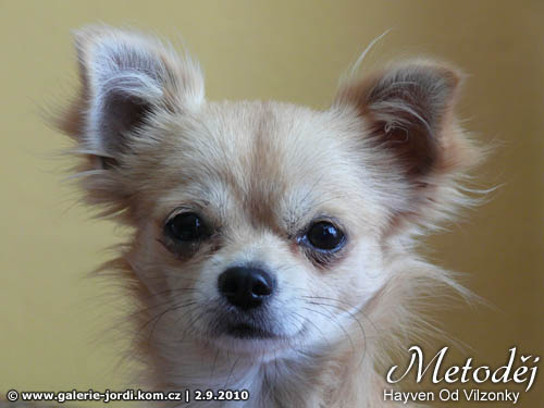 Hayven alias Metoděj je pejsek čivavy dlouhosrsté, barvy plavé s melírem.